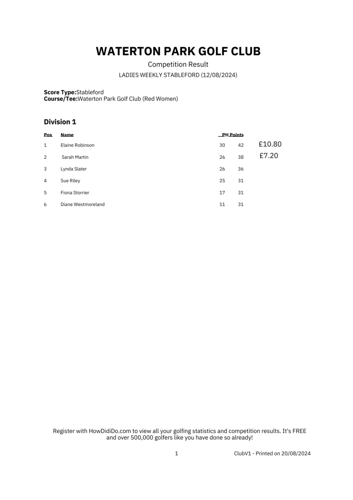 LADIES WEEKLY STABLEFORD (12/08/2024)